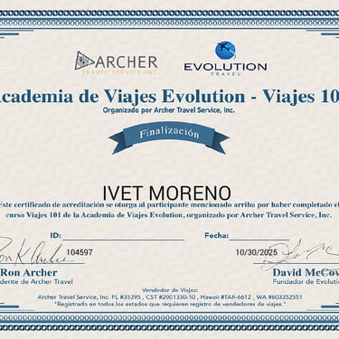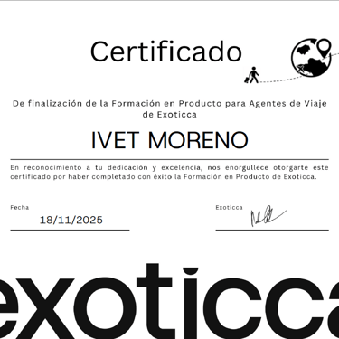 Trabajo con proveedores internacionales y destinos que exigen certificaciones específicas y actualizaciones periódicas. Esto me permite conocer de primera mano sus productos y particularidades, para recomendar siempre con criterio y seguridad.